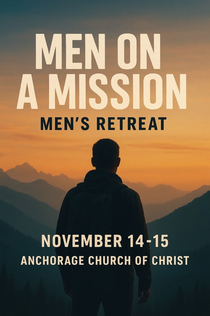 2700 DeBarr Road Anchorage, AK 99508 Directions Register anchorage church of Christ November 14 – 15, 2025 Begins with check-in and dinner at 6:00 PM Men’s Retreat, 2025 “Men on a Mission” Join us for a weekend filled with the Word of God, brought to you by Chris Kidwell, Pulpit Minister Pauls Valley church of Christ in Oklahoma